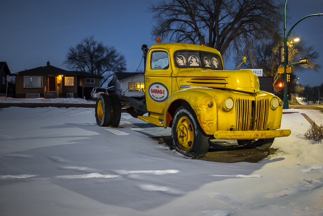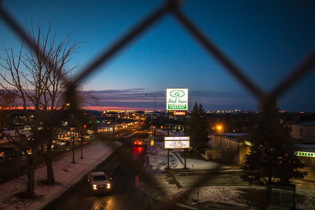 We found a old post cards online showing the place during its Frontier days – it was pink once! There’s the gas pumps too, right in front of what is the present day office. The sign is somewhat broken something we’ll see time and again this evening. Medicine Hat needs a neon tech!