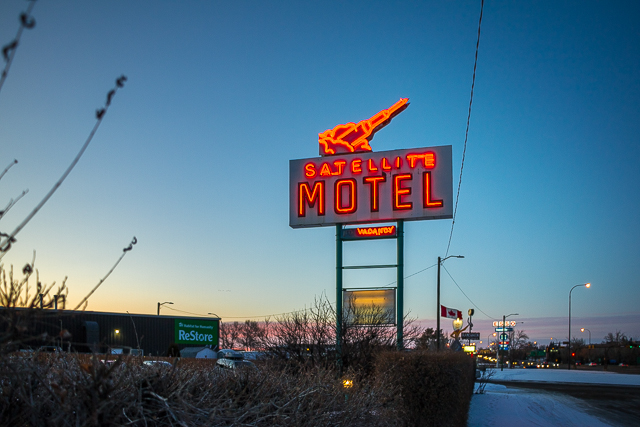 16-17) The Satellite Motel dates back to the early 1960s, although for a while back then it had a different sign. They offered Colour (color) and Cable TV in the late 1960s, which was pretty cutting edge for the time. They are likewise having a problem with their neon (one side only) but even with this it still takes top prize as the best sign this night. The Satellite sits alongside the Trans Canada, but set back on a service road.
