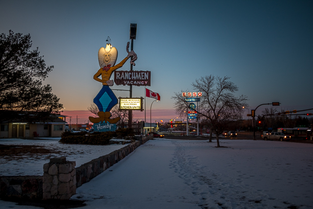 18) Turning around, it’s our place, the Ranchmen, the iconic smiling cowboy hard to miss. That’s the Trans Canada to the right. In times past the motel offered âFree TVâ (those guys were saints!) and advertised they had â44 Modern Unitsâ. I think they have more now.