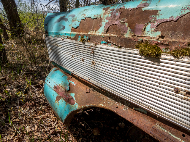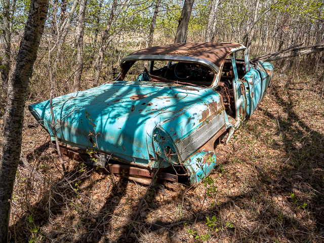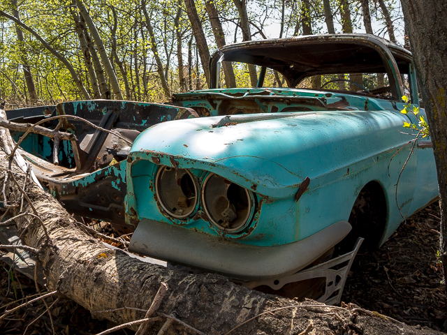 Here’s a spring discovery and had things greened up more, we’d have never spotted this derelict 1958 Buick hidden in the trees. Out here on the backwater prairies, it’s rare to find such an upscale car from that era and most rural folks back then drove pickups, or something else workaday. You wanted a car that could handle the rough and dusty roads and something so nice was a poor fit. Not that many could even afford such a classy ride. This is farming and ranching country, as hard on vehicles as it is to those who call it home and pavement is often a luxury (even today).