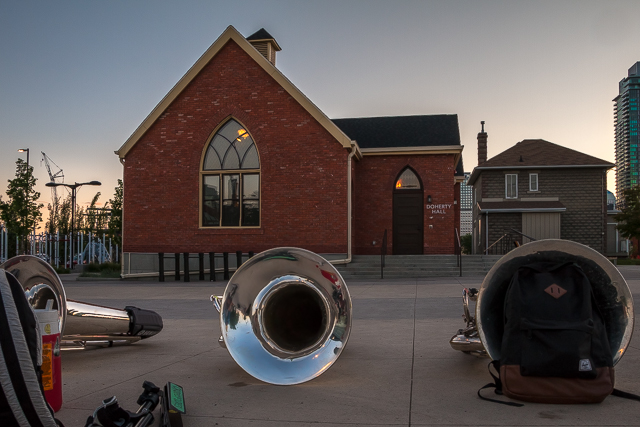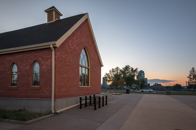 Today we’re in the Calgary community of Victoria Park and right beside the Stampede Grounds. Stampede? It’s a low-key, intimate event that’s been around for a few years, so maybe you haven’t heard of it. The first of our subjects is a replica of Westbourne Church that once stood a few blocks away and includes some salvaged pieces from the original. It’s now called Doherty Hall but still looks the part of a church.
