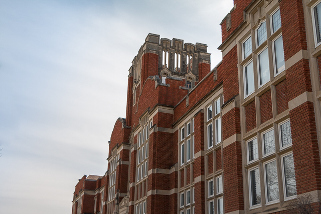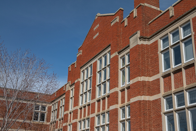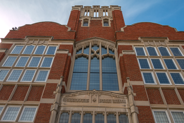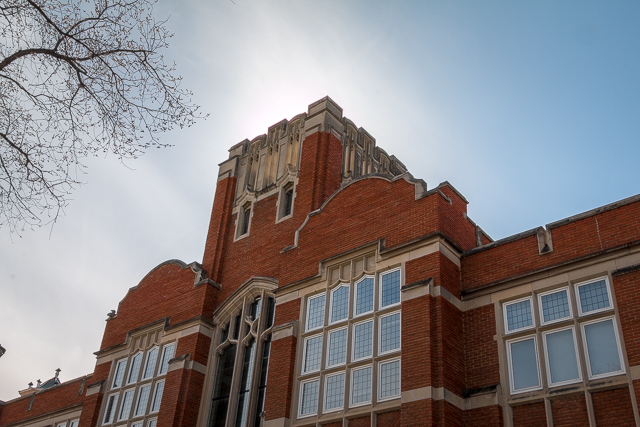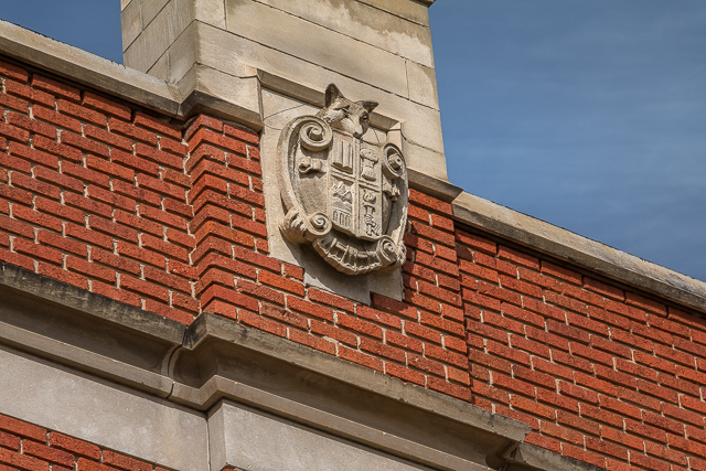 Collegiate Gothic building typically feature towers, buttresses, and crenellations (like a battlement, low walls atop a roof with regular-spaced indents) which gives an almost castle-like appearance. Stately entrances and stone carvings are also a common feature. Bricks came from a local source and Limestone from Indiana. Those wood doors are substantial and mean business.