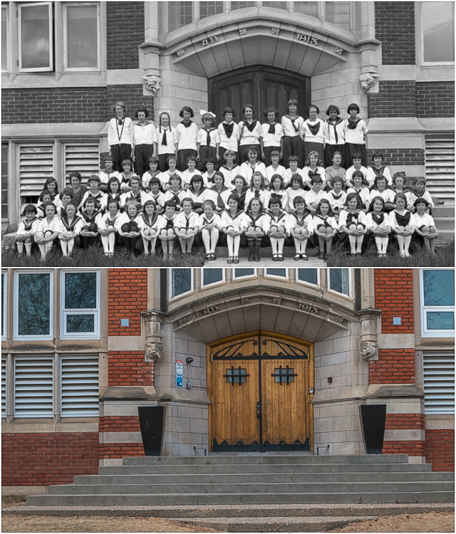 When planning this piece, we located a school we thought was the one in the Then photo and that was good enough for us. Bingo, shot, done, it’s in the can and there’s nothing really to question.