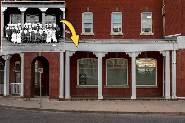 The building we’re documenting today is well over a hundred years old, and early on, but very briefly, functioned as the Ogden Hotel. They offered lodging and the Beer Parlour, thanks to its strategic location and circumstance, did well. More on this on a moment. During World War One the Red Cross converted the building into a military convalescence hospital and that’s the era of our Then photo.